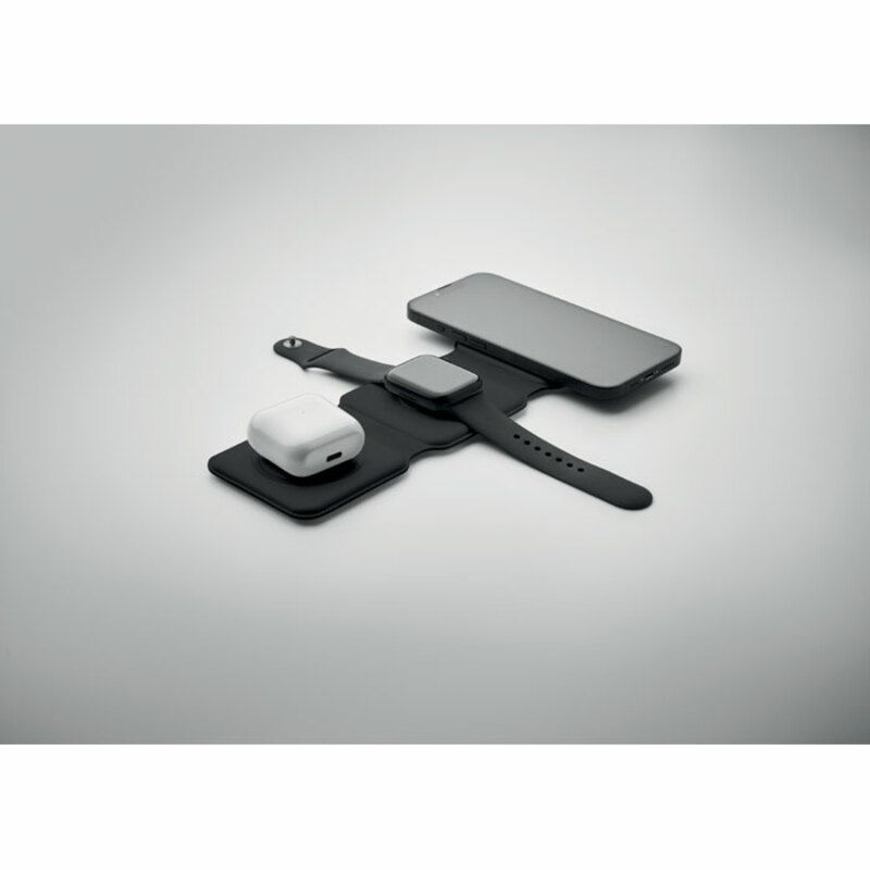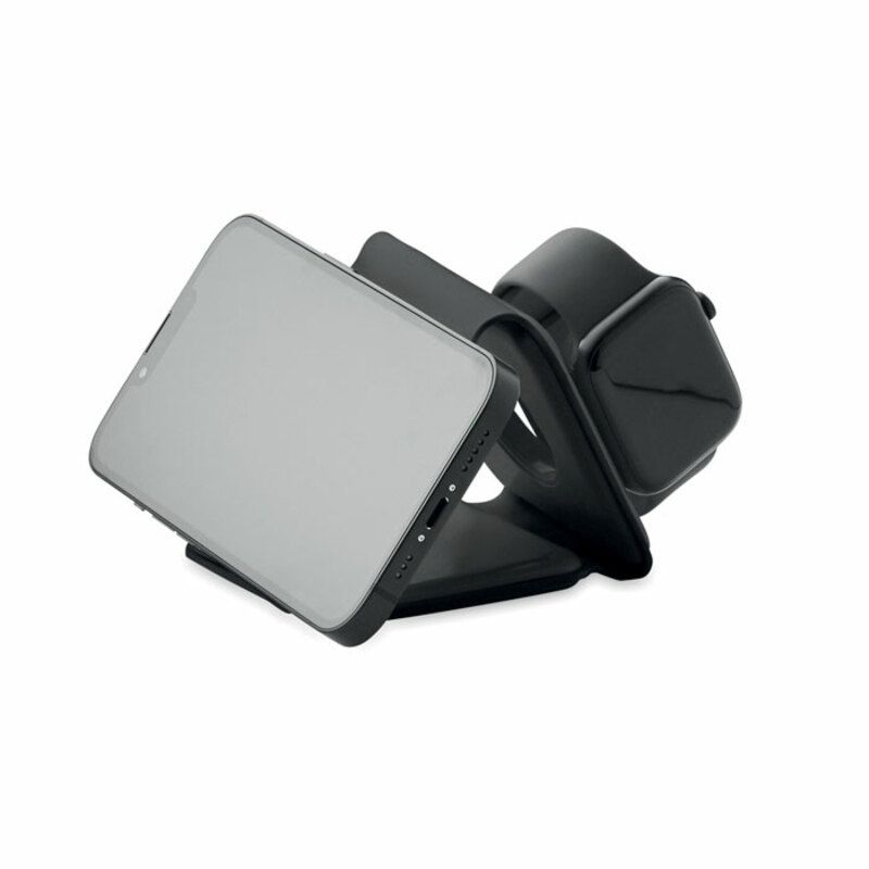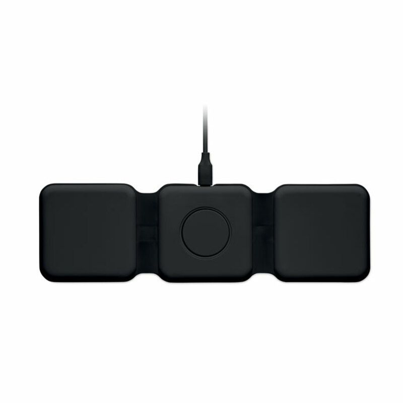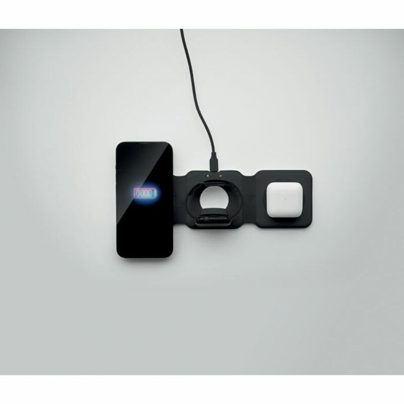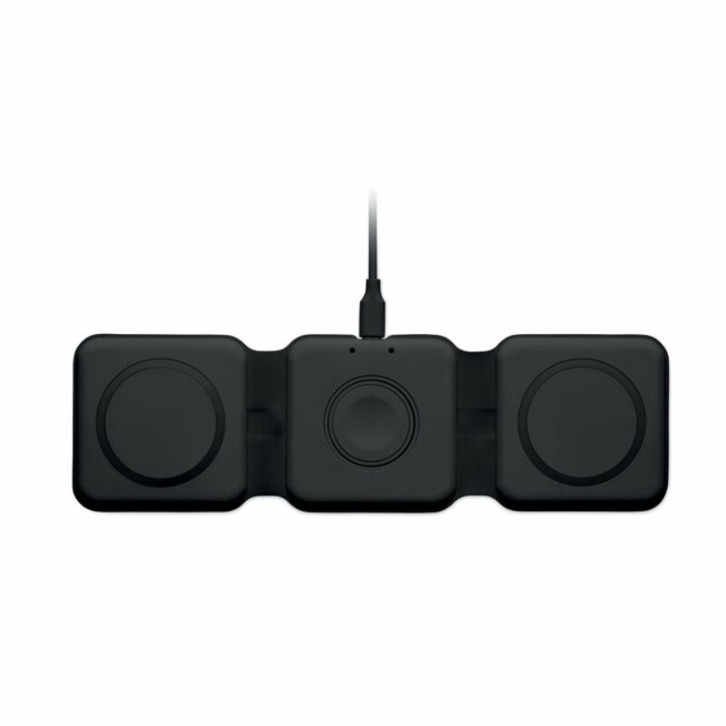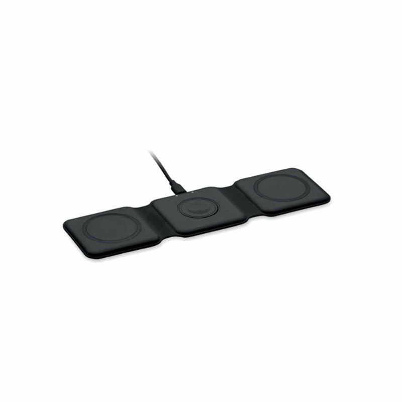 Base carga promocional Orio de 3 en 1 fabricado en ABS y dispone de 3 puntas de carga inalámbrica de 15 W. Posee entrada 2 en 1 Tipo C y A y es compatible con todos los dispositivos de carga QI.