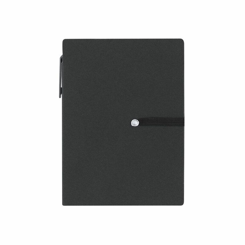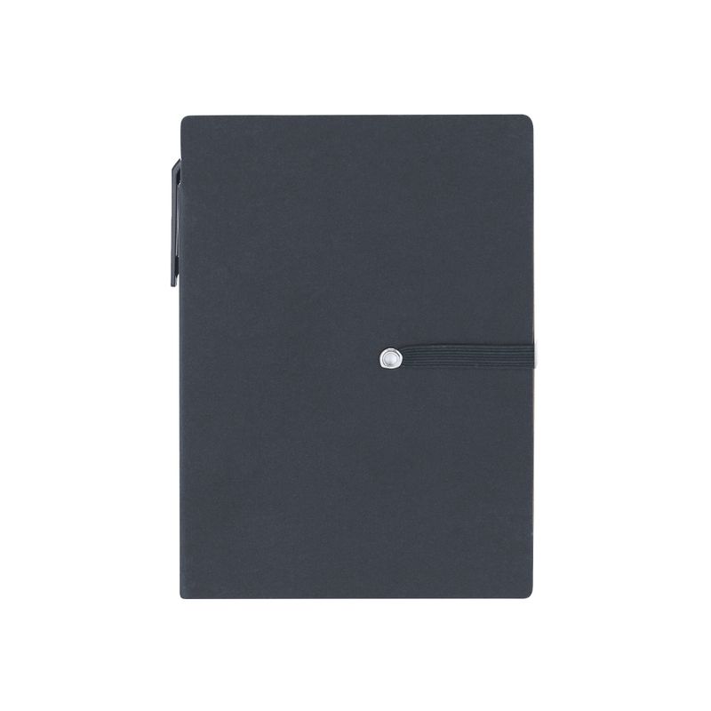 Además, incluye un bolígrafo de cartón reciclado con tinta azul y sistema pulsador, práctico para escribir sobre el bloc o las mininotas. La cinta elástica a juego asegura el cierre del bloc, manteniendo todo protegido y facilitando su transporte. Un accesorio funcional, sostenible y completo para uso diario.