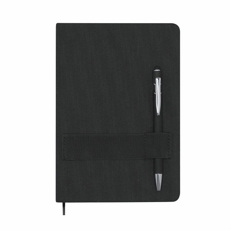 Bloc de notas en tamaño A5 fabricado en elegante RPET, con portadas rígidas en acabado tela que combinan durabilidad, estilo y sostenibilidad. Su interior de 80 páginas a disposición de una raya ofrece un espacio ideal para tomar notas, realizar apuntes, organizar ideas o planificar proyectos, mientras que el marcapáginas de cinta y el sobre en la contraportada facilitan la organización y el almacenamiento de documentos pequeños o notas sueltas.