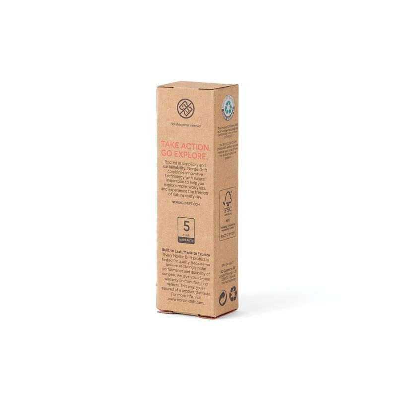 Los controles de calidad sobre el embalaje sin plásticos con certificación FSC® refuerzan el compromiso con la conservación de los ecosistemas forestales. La durabilidad mecánica del conjunto está respaldada por una garantía de 5 años ante defectos de fabricación, asegurando una vida útil prolongada incluso bajo condiciones de uso intensivo al aire libre. Se trata de un lápiz infinito extremadamente fiable que combina navegación y escritura en un solo cuerpo compacto, optimizando el equipo esencial de cualquier aventurero moderno.