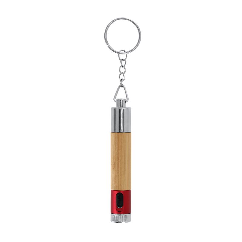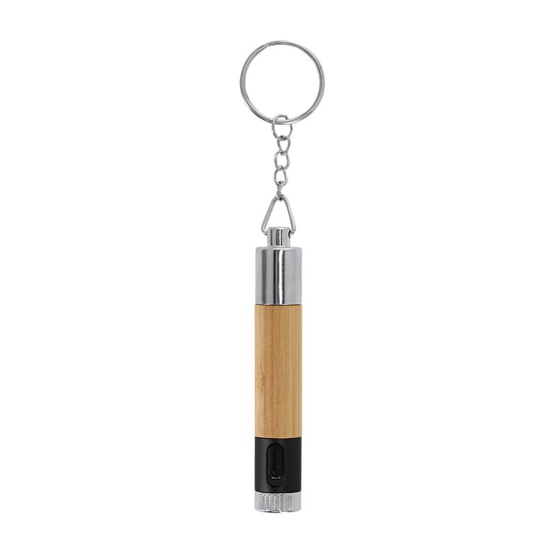 La estética de este artículo se ve reforzada por una capucha protectora que incluye una anilla metálica cromada, permitiendo colgarlo o asegurarlo con facilidad en carpetas y llaveros. Para garantizar su funcionamiento inmediato, el producto viene con las pilas de botón incluidas, asegurando que la linterna esté lista para su uso desde el primer momento. La combinación de texturas entre el bambú natural y los acabados metálicos brillantes proyecta una imagen de modernidad y cuidado por el detalle, siendo un regalo corporativo de alto valor percibido.