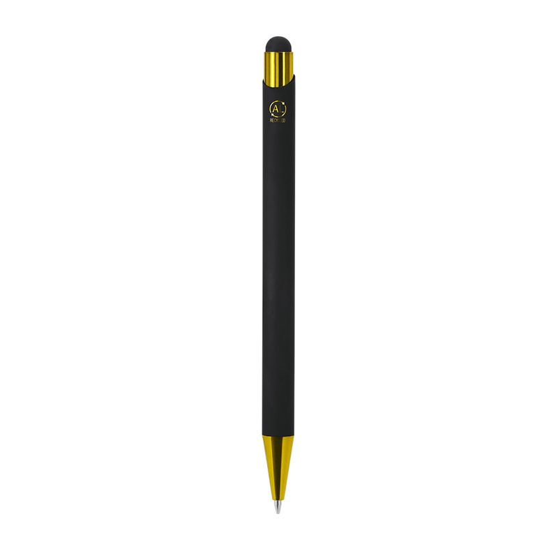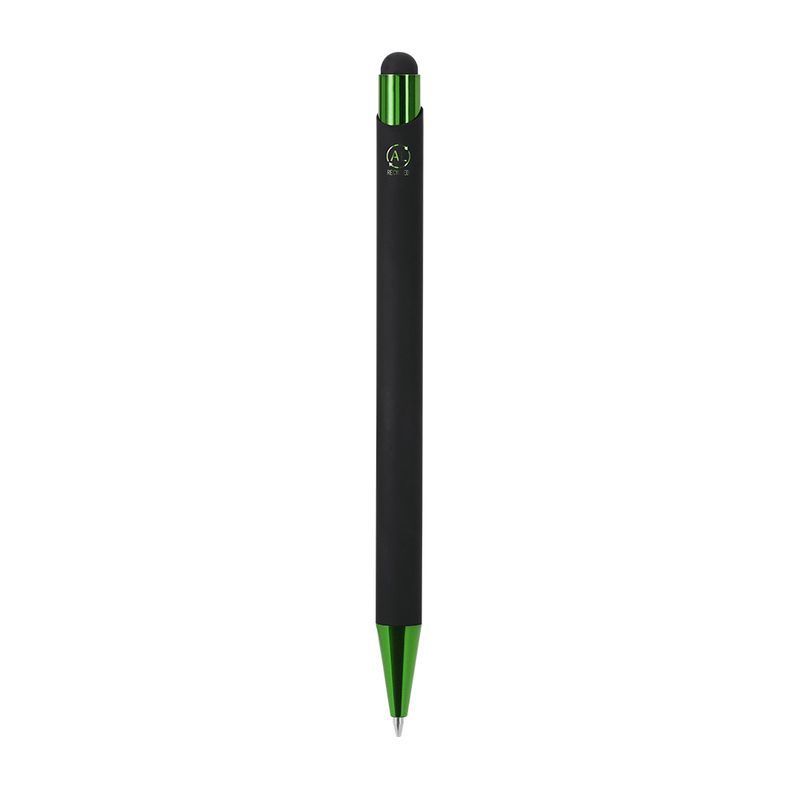 La funcionalidad del dispositivo se ve potenciada por la integración de un puntero en la parte superior, ideal para interactuar con pantallas de smartphones y tabletas sin dejar huellas. Su estructura de aluminio reciclado garantiza una ligereza excepcional y una resistencia superior, luciendo el distintivo oficial de material recuperado para avalar su origen responsable ante el cliente final. Los detalles del pulsador, el clip metálico y la punta cuentan con un acabado brillante que contrasta armoniosamente con la sobriedad del cuerpo engomado.