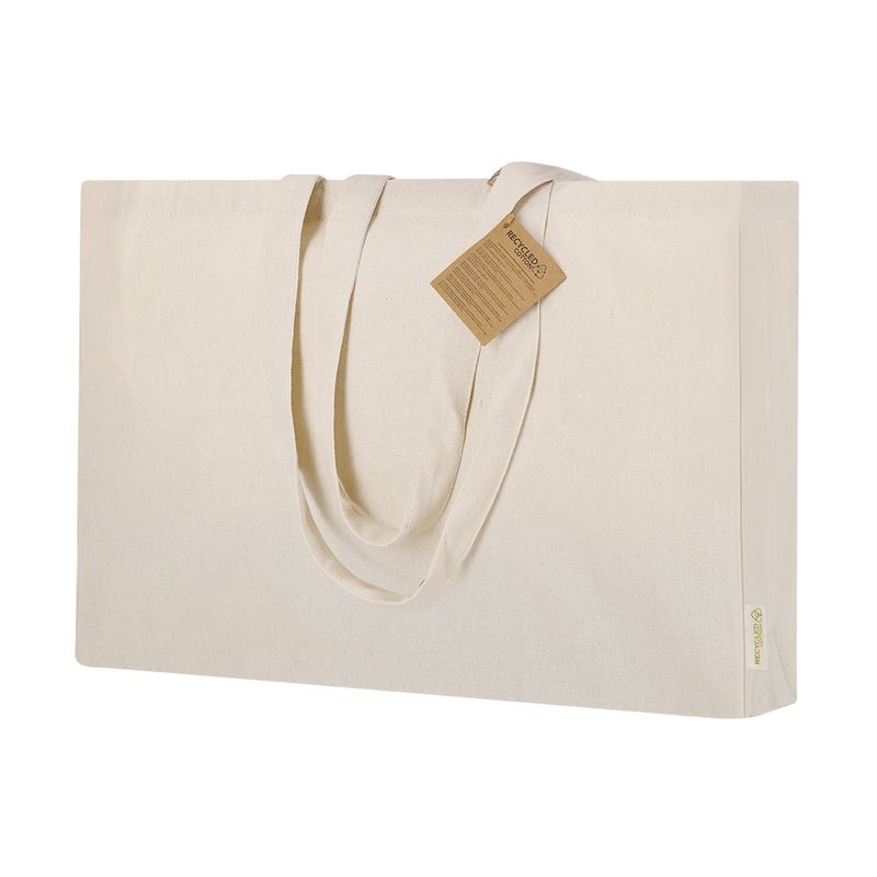 La bolsa de algodón reciclado Tremul es un accesorio de transporte sostenible de 220g/m2 que destaca por su diseño con fuelle en base y laterales y sus asas largas reforzadas de 70 x 2,5 cm. Este modelo combina fibras recuperadas con poliéster RPET, ofreciendo una estructura de gran firmeza que incluye el distintivo oficial de material circular. Su estética natural y robusta la convierte en el soporte publicitario ideal para empresas que buscan proyectar una imagen de durabilidad, compromiso ambiental y calidad técnica en sus campañas promocionales.