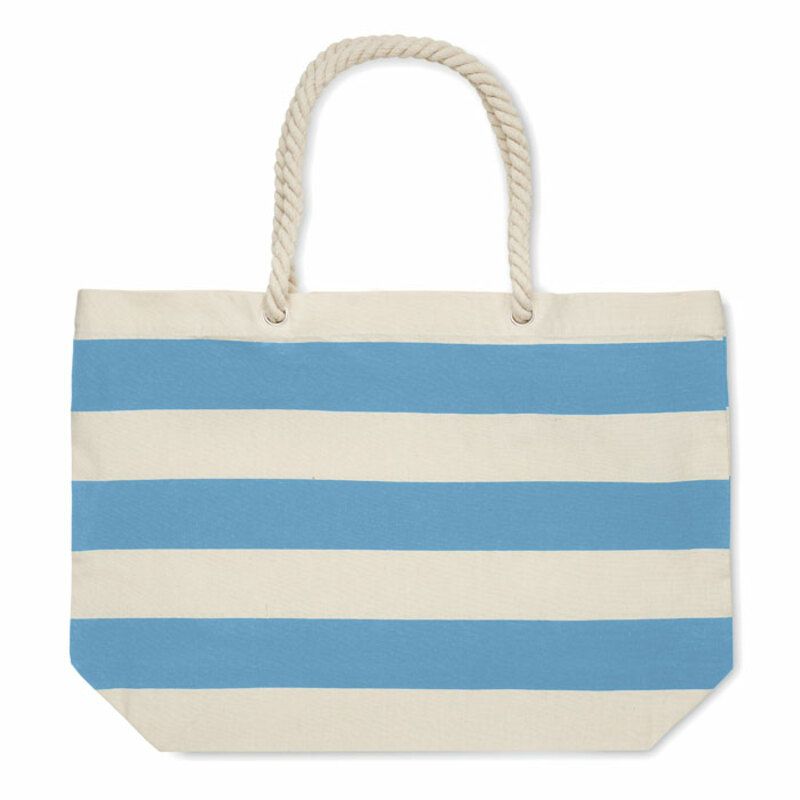 Bolsa de playa personalizada Heaven también puede servir para la compra, es una bolsa fabricada en algodón de 220 gr/m² y con un diseño de rayas con asa de cuerda.