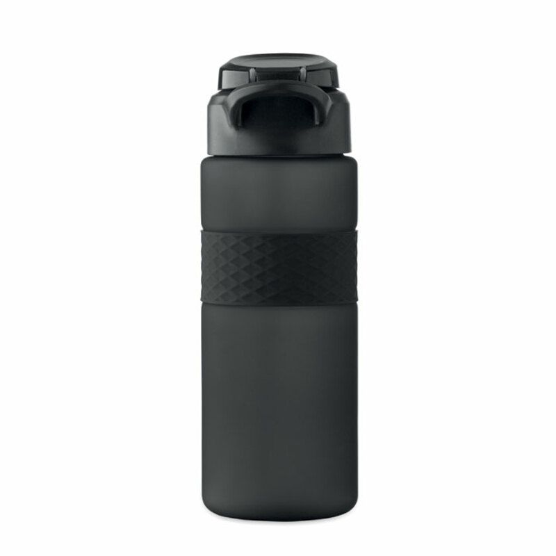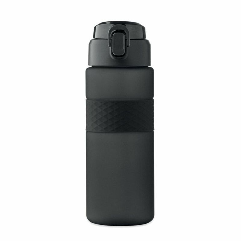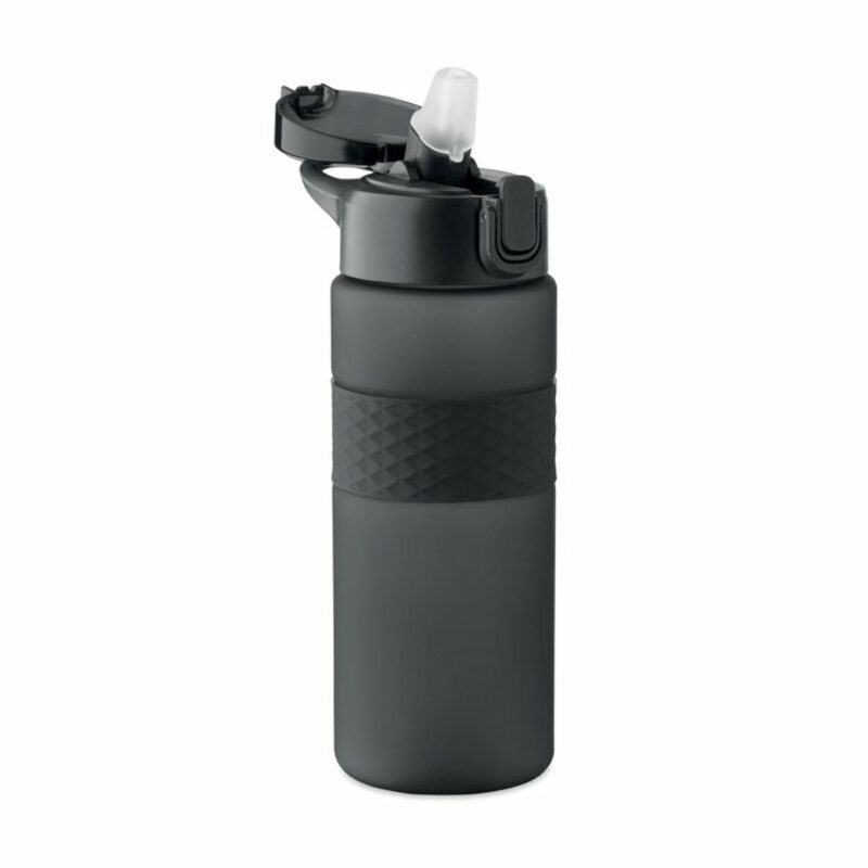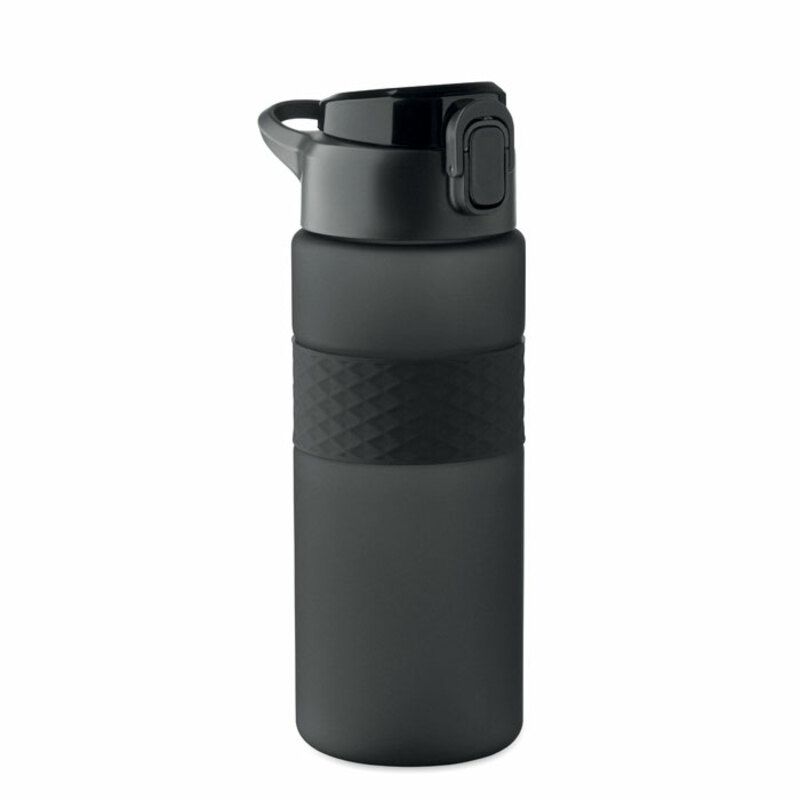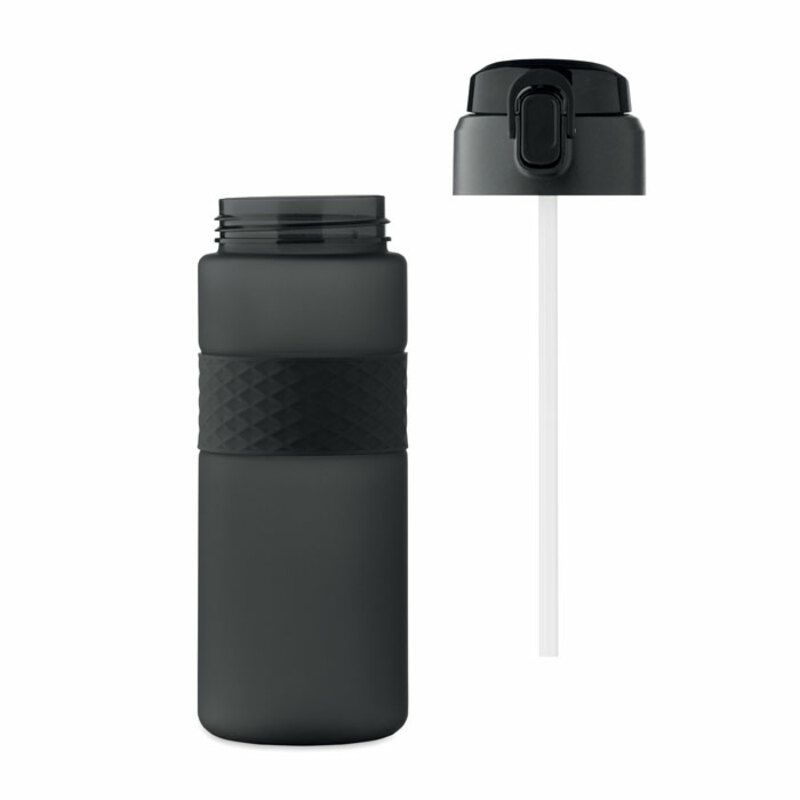 Cuenta con una tapa abatible de PP y un cierre de seguridad, que garantiza que la botella sea completamente antifugas, mientras que la pajita integrada permite beber cómodamente con una sola mano. Además, su asa de silicona facilita el transporte, aportando comodidad y practicidad en cualquier situación.