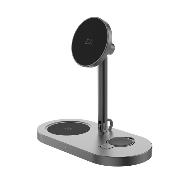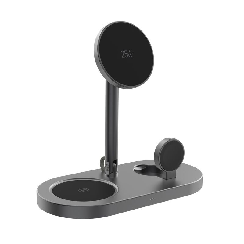 Disfruta de carga inalámbrica ultrarrápida de hasta 25W con este cargador de escritorio 3 en 1 Quantum, diseñado para alimentar simultáneamente teléfono, reloj inteligente y auriculares. Su formato compacto ayuda a mantener el espacio organizado, convirtiéndolo en una solución práctica para entornos profesionales y uso diario.