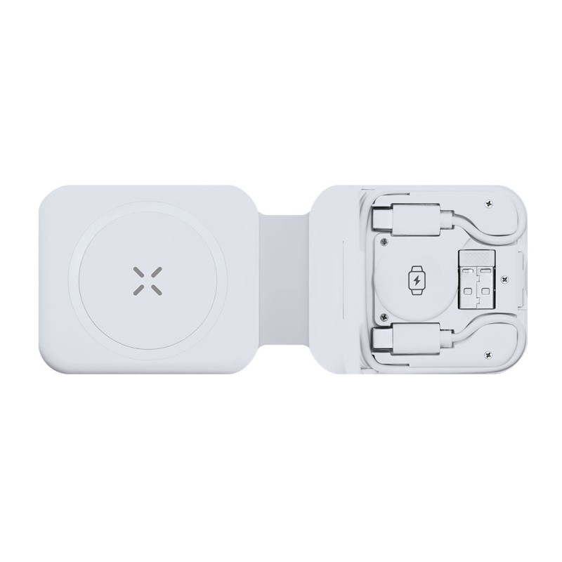 Multicargador inalámbrico 15w plegable Vardar 3 en 1 diseñado para cargar simultáneamente smartphone, auriculares y smartwatch en una única estación de carga. Una solución práctica que centraliza todos tus dispositivos en un solo soporte funcional y organizado.