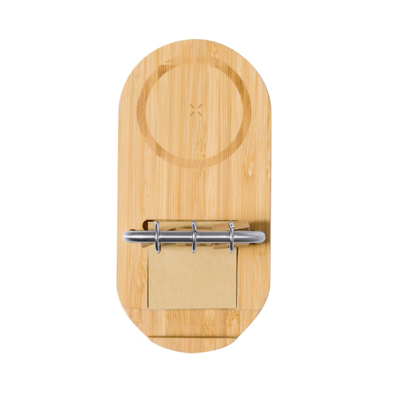 Cargador multifunción personalizable bambú Sainford, inalámbrico 15W en bambú con soporte para smartphone, calendario perpetuo y bloc de notas adhesivas. Carga simultánea para 3 dispositivos y amplia superficie de marcaje. Ideal para promociones corporativas.