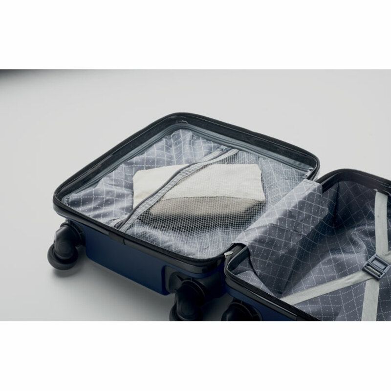 El interior de la maleta ha sido diseñado pensando en la organización y la seguridad de tus pertenencias. Dispone de un bolsillo interior con cremallera, perfecto para almacenar objetos pequeños o de valor, como documentos, cargadores o artículos de aseo, manteniéndolos seguros y accesibles en todo momento. El compartimento principal ofrece un amplio espacio para ropa y otros artículos esenciales, con correas de sujeción que aseguran que todo se mantenga en su lugar durante el viaje.