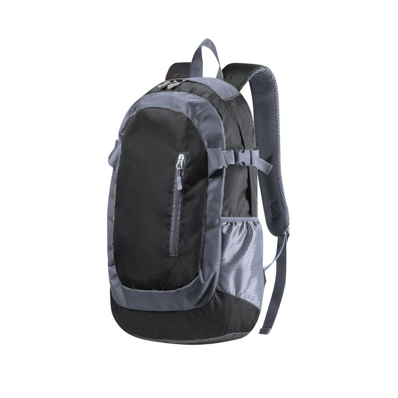 Mochila técnica publicitaria en resistente combinación de poliéster 210D y ripstop. Está diseñada con cierre de cremallera de doble tirador metálico y bolsillos en la parte frontal para facilitar la búsqueda y distribución de artículos. También cuenta con refuerzos de nylon ajustables en los cierres y esquinas reforzadas.