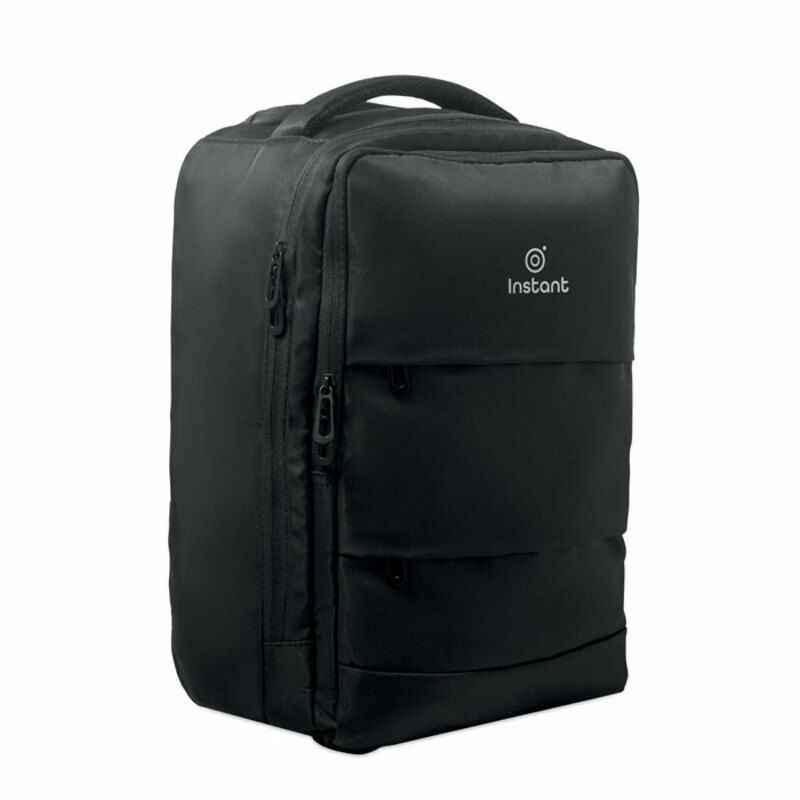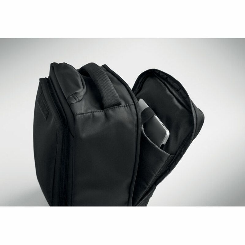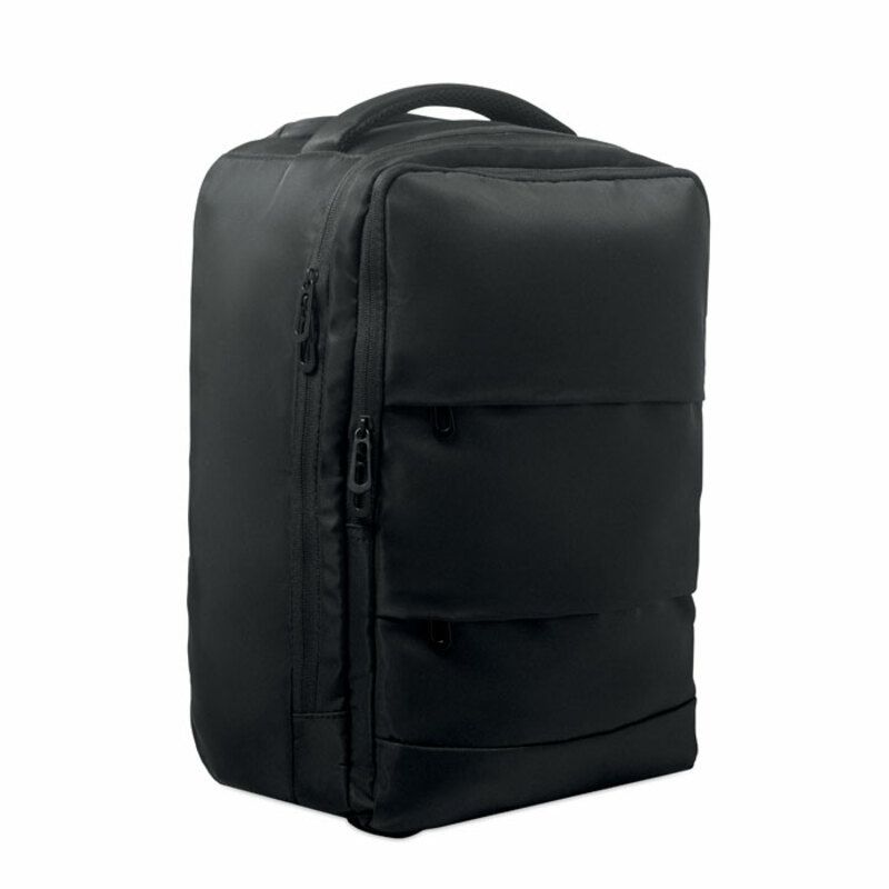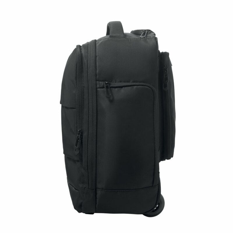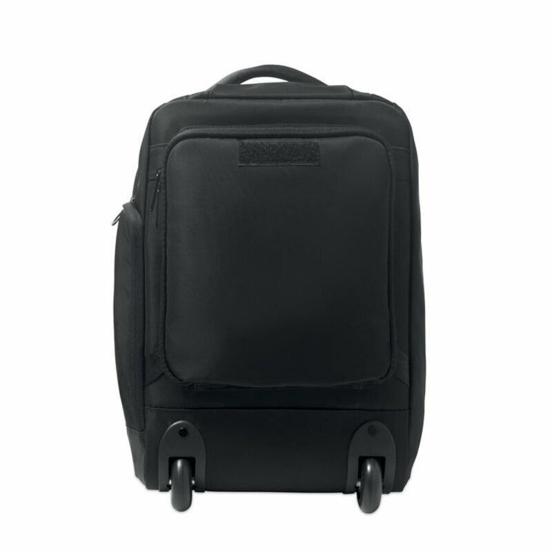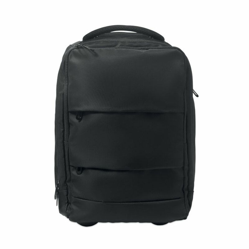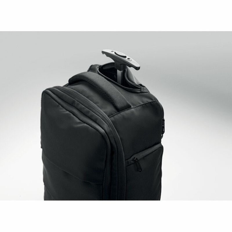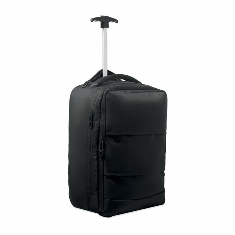 La espalda acolchada y los tirantes ajustables aportan comodidad en el uso prolongado, mientras que el bolsillo trasero con cremallera añade un espacio adicional de almacenamiento seguro. Por su versatilidad y su fabricación en material reciclado, esta mochila trolley se posiciona como un regalo corporativo funcional y alineado con valores de sostenibilidad para campañas de empresa o acciones promocionales.