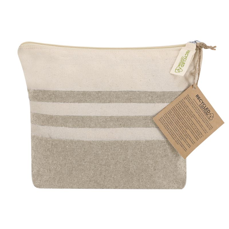 El neceser fabricado principalmente en algodón reciclado 180 g/ m2 en elegante tono natural con diseño a rayas horizontales Daronel es un accesorio de organización que destaca por su composición sostenible y su estética de inspiración mediterránea. Este modelo ofrece una solución de almacenamiento ecológica, utilizando fibras recuperadas y poliéster rpet para fomentar la reutilización de recursos textiles y reducir la huella ambiental. Su diseño cálido y orgánico lo convierte en el soporte publicitario ideal para marcas de cosmética natural, spas, hoteles boutique o campañas de sostenibilidad que busquen un detalle práctico con un firme compromiso por el respeto al entorno.