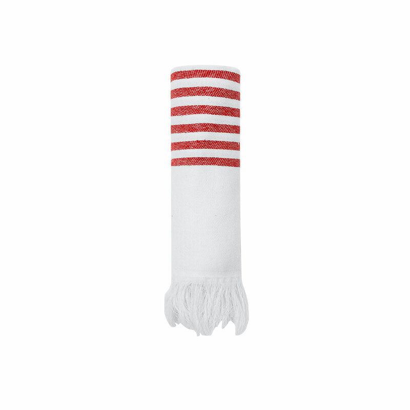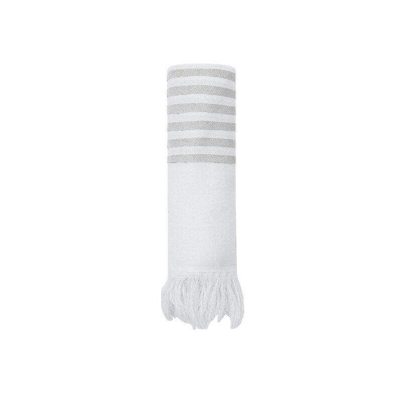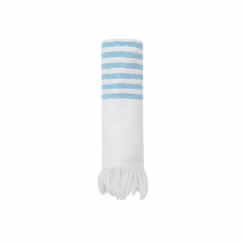 El diseño presenta una base en color blanco combinada con rayas en tonos vivos, creando una estética fresca y atemporal. Los flecos decorativos en los extremos aportan un acabado cuidado y distintivo, reforzando su atractivo visual tanto en la playa como en la piscina o en eventos estivales.