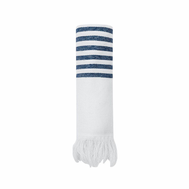 El diseño presenta una base en color blanco acompañada de rayas en distintos tonos, aportando un estilo fresco y atemporal. Los flecos decorativos en los extremos refuerzan su carácter cuidado y aportan un acabado distintivo, ideal para destacar en la playa, la piscina o eventos al aire libre.