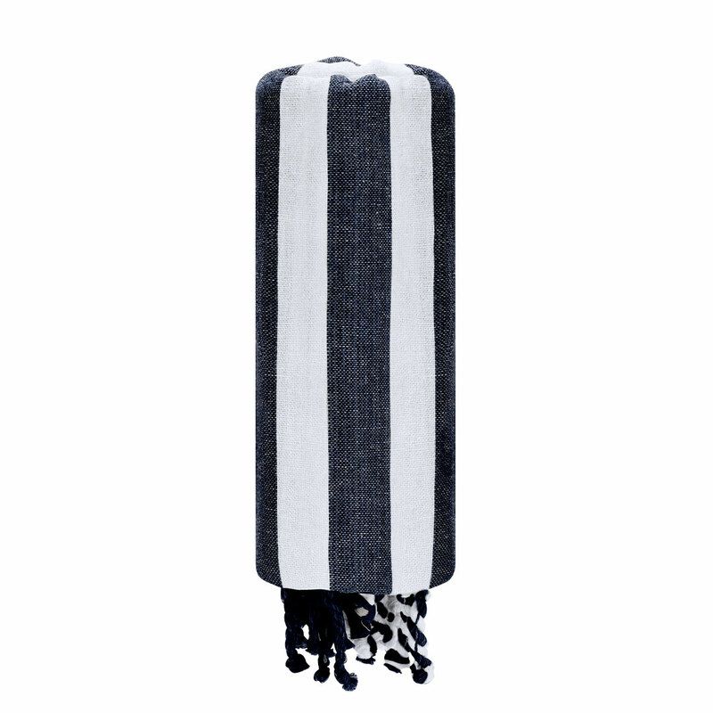 El diseño presenta una base en color sobre la que destacan rayas blancas, creando una estética fresca y actual. Los flecos en los extremos aportan un detalle decorativo que completa su acabado y refuerza su carácter cuidado, pensado para destacar en entornos como la playa, la piscina o actividades al aire libre.