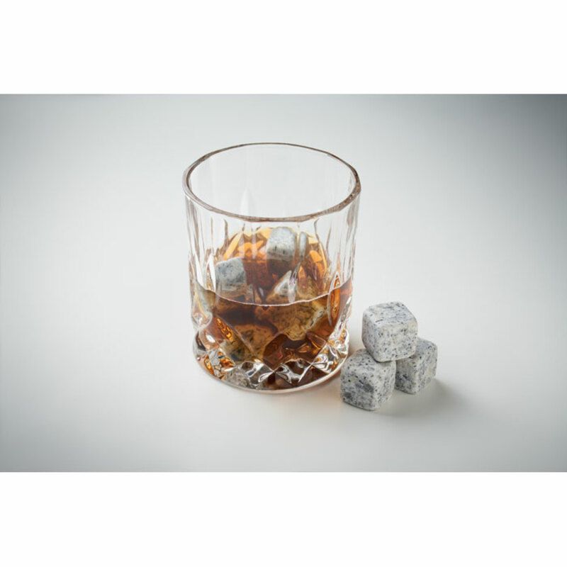 Incluye 9 piedras tipo cubito de hielo que permiten enfriar bebidas de forma eficaz sin diluirlas, manteniendo intactas sus propiedades. Se acompañan de una bolsa de terciopelo que facilita su almacenamiento y conservación tras cada uso.