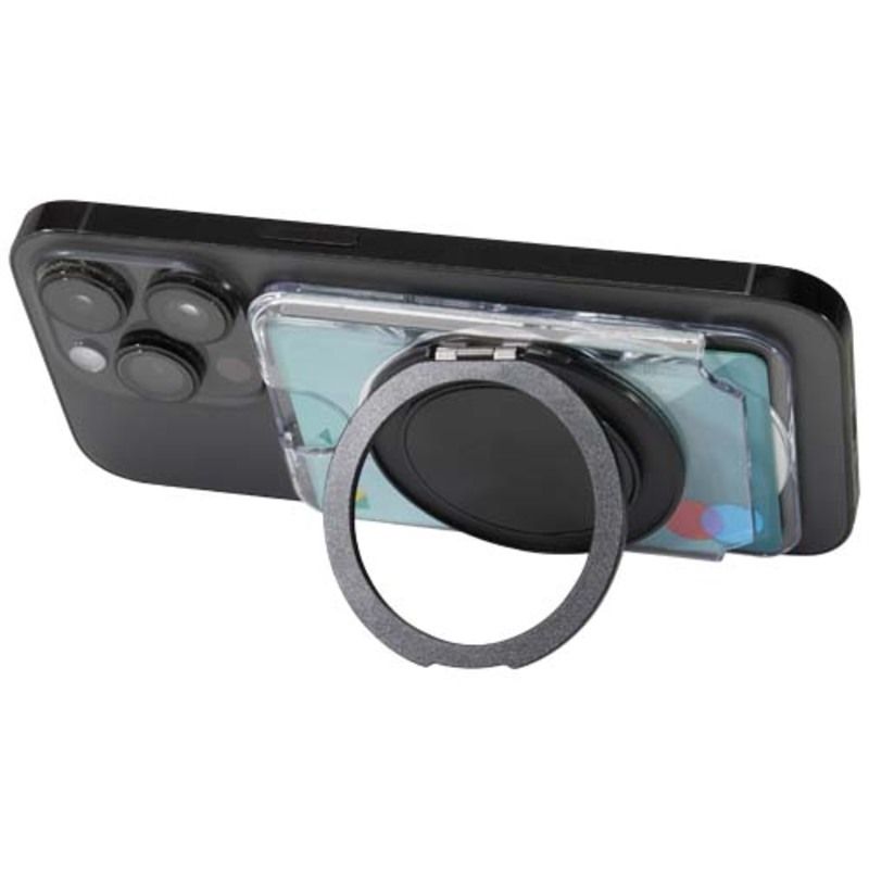 La cartera transparente con sistema magnético, compatible con iPhone 12 y modelos posteriores, permite transportar una tarjeta de forma segura gracias a su fijación tipo MagSafe. También incluye un anillo metálico adicional para poder utilizarla con otros teléfonos móviles, ampliando su compatibilidad. Este set tecnológico y funcional destaca como regalo promocional personalizado, ideal para reforzar la imagen de marca con un producto útil, moderno y sostenible.