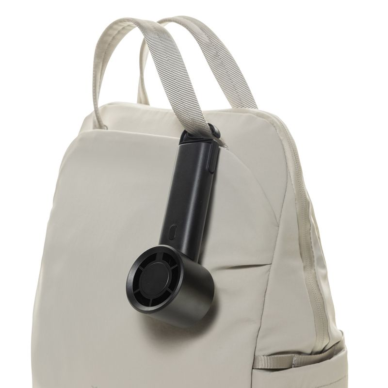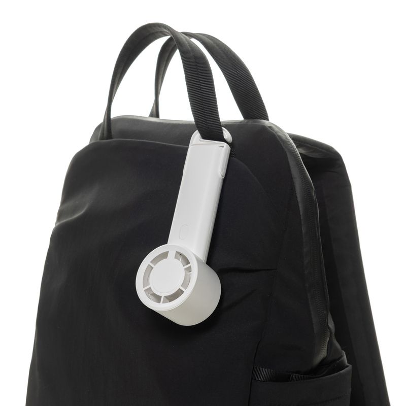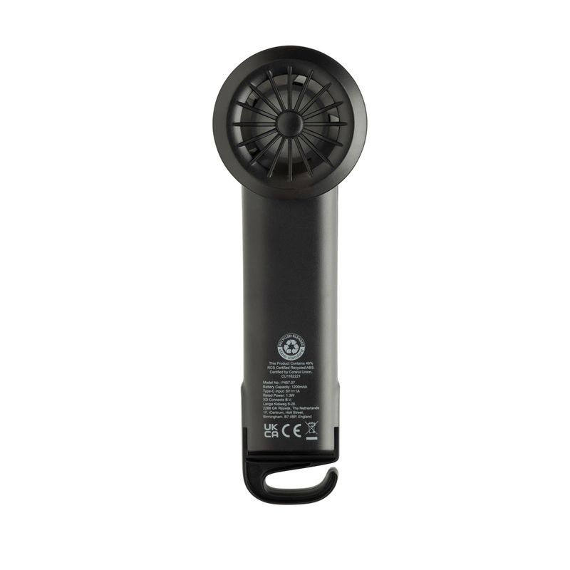 Fabricado con un 35% de ABS reciclado certificado RCS, incluye batería recargable de iones de litio de 1200 mAh, que ofrece hasta 6 horas de funcionamiento tras 3 horas de carga con el cable USB-A a USB-C TPE incluido. Cuenta con tres niveles de velocidad ajustables y un gancho extensible que también funciona como soporte.